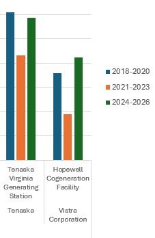 An industry analyst, who shares data compiled by public sources, has tracked how Virginia’s generation plants slowed their operations during the RGGI years and then increased their use again after Governor Glenn Younkgin pulled Virginia out of compact. The chart is too big to fit in a single post. However, you can view it here. This post has included portions of the chart.