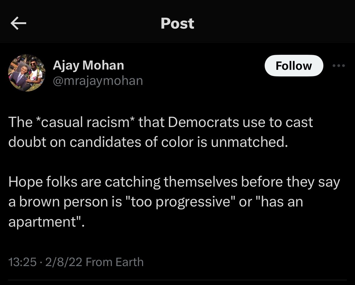 You need to FIRE Ajay Mohan! Being racist is no way to represent your constituency as a sitting Virginia Senator or Congressman.